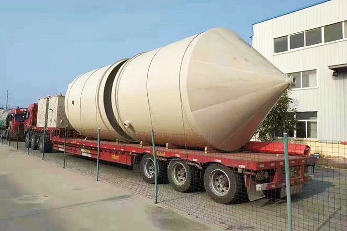 錐底儲(chǔ)罐采用意大利技術(shù)制作,內(nèi)襯層為噴射成型制作,內(nèi)襯層的富樹脂層樹脂含量達(dá)95%,內(nèi)襯層樹脂含量為80%。儲(chǔ)罐內(nèi)襯層采用錐形水泥模具制作,儲(chǔ)罐結(jié)構(gòu)層為整體纏繞制作而成。罐體底部為帶鋼套環(huán)支腿,大大提升儲(chǔ)罐穩(wěn)定性。攪拌型錐底立式儲(chǔ)罐,內(nèi)設(shè)擋流板,罐體頂部設(shè)置支撐架,儲(chǔ)罐輕質(zhì)、高強(qiáng),耐腐蝕性強(qiáng)、使用壽命長。